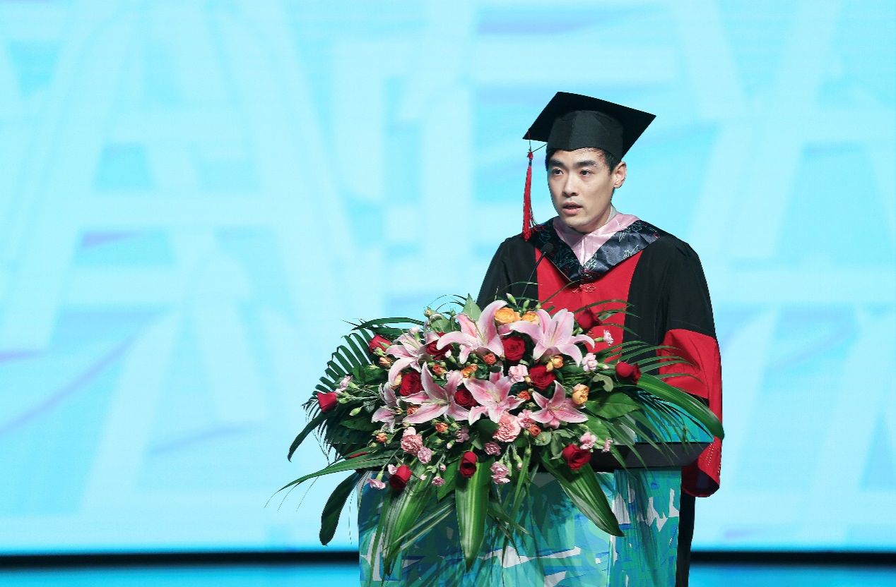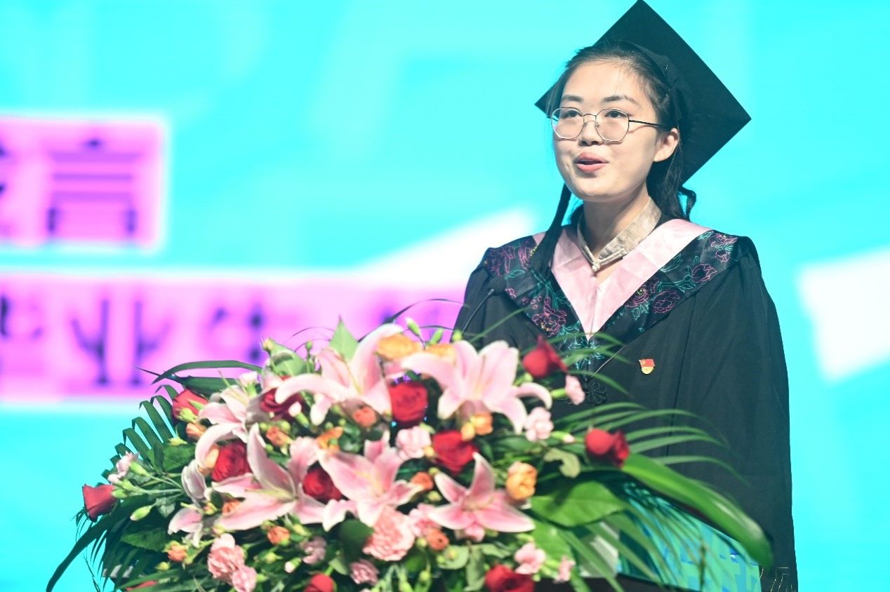 在庄严的国歌声中,毕业典礼正式开始。2023届国画专业本科毕业生胡雅歌代表本科生发言,她回忆了在公司国画系求学四年的所见所闻、所思所感,对于未来,她希望大家都能怀有足够的勇气去面对未知的挫折,追逐梦想,在未来的人生道路上乘风破浪,不坠青云。