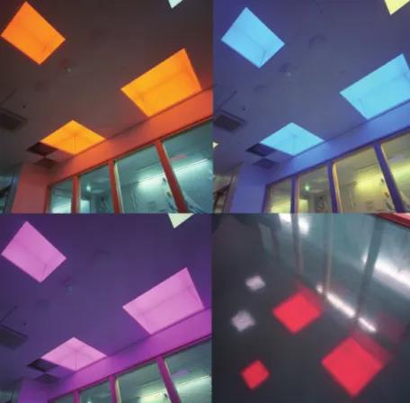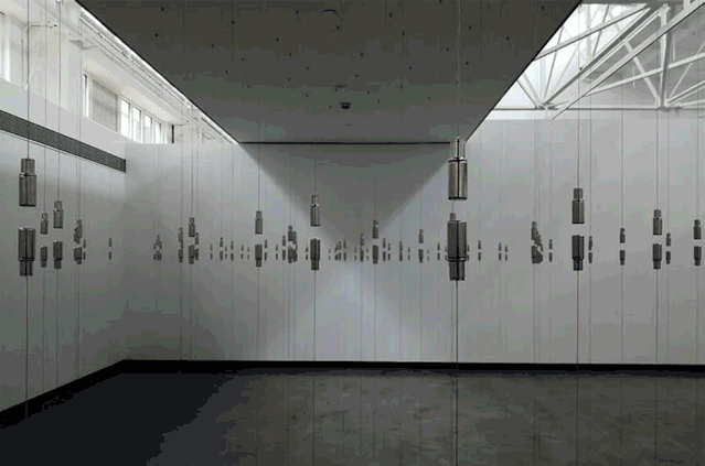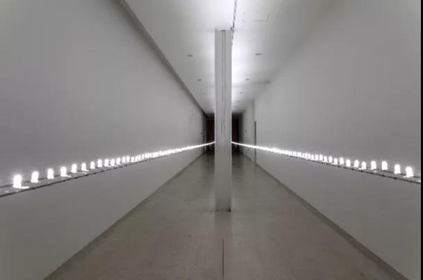 汤米·格伦德和佩特里·尼苏南都有建筑学的背景,他们不只追求形式感的满足,而是更多考虑使用者的心理和情感,用灵活而多样的作品形式开拓多重的空间。源于对空间的本质抱有充分的尊重,空间体验通常是格伦德-尼苏南作品中不可或缺的一部分,他们也会使用人造光影或自然光线并结合声音去营造所需的气氛。“空间性是我们作品中的一个主要元素,每一次布置艺术作品也总是我们学习掌握了解空间的过程”。上海民生现代美术馆展出的作品《LED地平线》,所在的一楼走廊区域并不是美术馆常规展厅,作品的构成与空间中的梁柱成为了一个整体,狭长的走廊上1600枚灯珠不规则地闪烁,头顶墙壁波动的光影让整个空间笼罩在冷冽而神秘的氛围中。