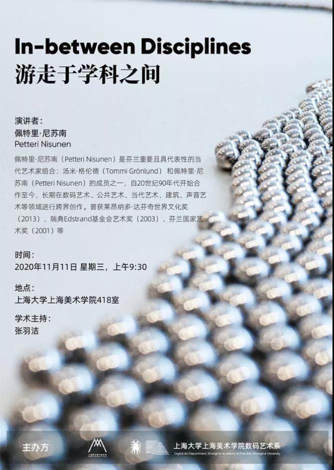 对于中国观众来说,芬兰艺术家组合格伦德-尼苏南(汤米·格伦德Tommi Grnlund和佩特里·尼苏南Petteri Nisunen)的名字或许有些陌生,但他们在欧美国家具有相当高的知名度和影响力。两位“60后”艺术家自90年代起至今已在世界各地举办过30余场个展,参加的群展上百场,同时也是各大双年展的常客。他们将艺术创作首先视为一种与大自然和谐共处的“手艺”,将图形、雕塑、建筑、运动和声音融入数学、光学、物理学等,通过独特的艺术方式,将日常而无形的“现象”转译为可视、可感之物,打开观看者眼,敏锐观看者的感知能力。值中芬建交70周年,上海民生现代美术馆推出该艺术家组合在亚洲的首次个展“随物生心”之际,我们和上海民生现代美术馆共同邀请艺术家组合之一的佩特里·尼苏南走入yl6809永利,为我们带来主题为“游走于学科之间”( In-between Disciplines)的讲座,与我们分享他们创作的心路历程。