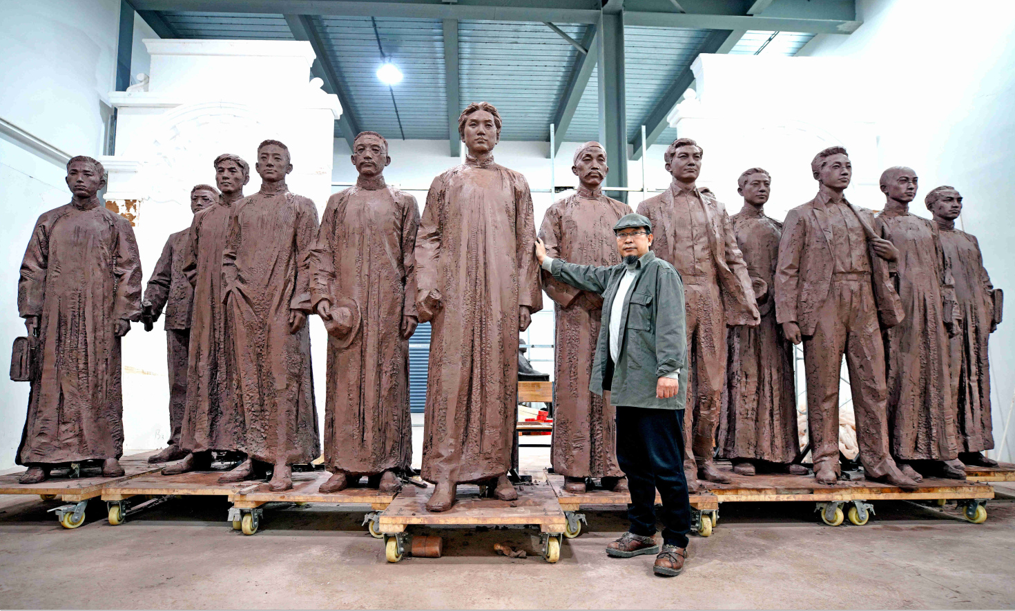 在中国共产党成立100周年之际,他为中共一大纪念馆新馆序厅创作了《历史选择 伟大起点》大型雕塑作品。雕塑表现了十三位一大代表步伐坚定地迈出石库门的历史瞬间。他们风华正茂、英气勃勃,象征中国共产党从这里诞生,走向全国,走向辉煌。同时,这件雕塑艺术作品采用了青铜铸造的艺术手法,使雕塑闪烁出金属坚硬与沉稳的质感,象征着雕塑主题所传达的澎湃激昂的革命情怀与坚定信念。雕塑运用写实和概括相结合的艺术表现手法,突出人物的精神气势,13个人物在保持相对独立的性格刻画的同时,强调雕塑完整的视觉面貌,使13个人物形成有机整体,凝练出坚强有力、充满理想的革命初心。为了尽量逼真地还原历史人物,他们团队细细研读了各个版本党史中关于“中共一大”的描述,反复搜集资料,对13位代表的家庭背景、个人经历、人物性格、年龄、身高、职业等做了分析表,力求准确刻画。现在,这件作品树立在中共一大纪念馆新馆,已成为党史教育的重要作品,每日接受来自祖国各地党员及群众的参观学习。