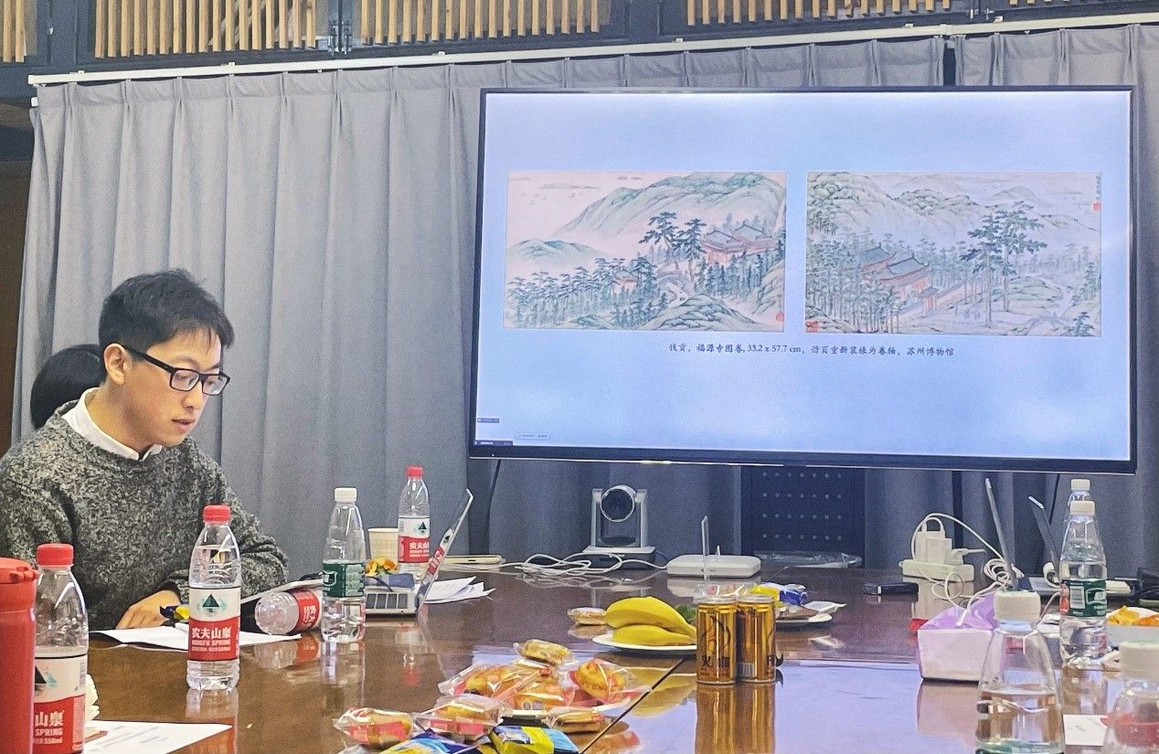翁传鑫博士报告的主题是 “十七世纪黄向坚(1609—1673)和《铁桥志书》里的贵州山水”,是基于他的博士论文《再现贵州:从明代到现代的意象》里的第一章。他首先分析了明代文人黄向坚在世仅存的三幅贵州盘江的图像及题记;他因为万里寻亲的经历而流传于世。演讲首先指出了贵州省博物馆的《盘江图》立轴和苏州博物馆的《盘江》册页不同的侧重点,并由此可以瞥见黄向坚在苏州创作大量“寻亲图”是如何“复制”同一经验的。随后翁传鑫分析了藏于纽约大都会艺术博物馆、真伪被质疑的《盘江》册页,指出这幅画从文字上和图像上难以和前两幅保持一致。这样的出入帮助引入《铁桥志书》这本少有学人涉足的方志。翁传鑫首先将关注点放到了这本方志当中十二页稀有而精美的版画。在分析了图像之中的文字性、物质性、以及神话与历史典故之后,他指出大都会博物馆《盘江》册页的出入可以在版画以及志书的诗文中找到对应,而且有可能该册页的创作者参看了这本志书。最后,他提到了铁索桥在抗日战争中发挥作用,作为茶马古道的节点被列为全国文物保护单位,以及在当代盘江上建起的桥梁成为贵州山水的第二重风景与中国工程创新的符号。
