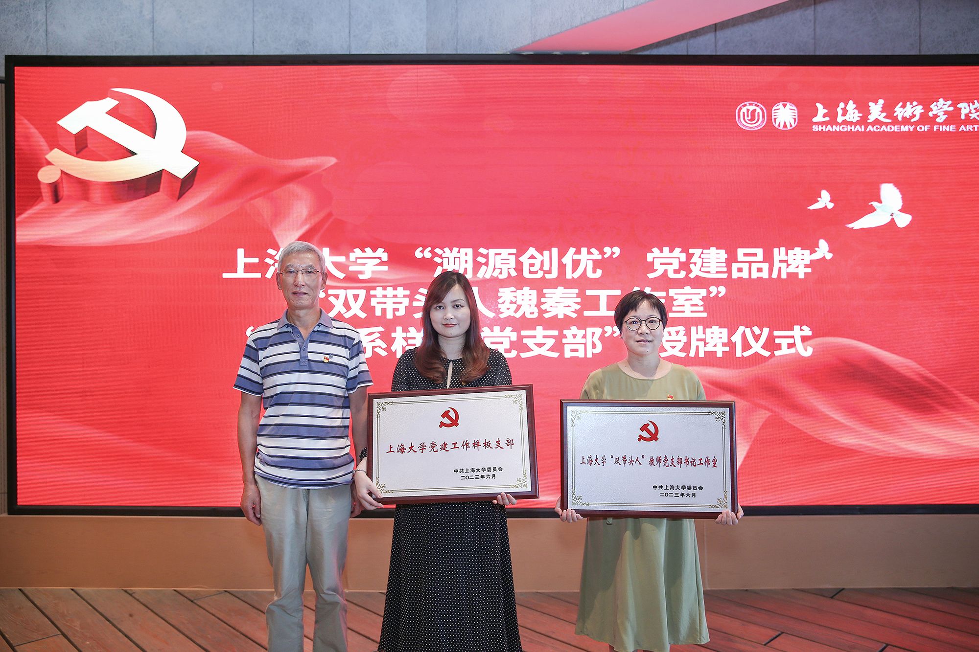 特邀党建组织员胡建国老师为yl6809永利“溯源创优”党建品牌“双带头人魏秦工作室”和“设计系样板党支部”代表授牌。