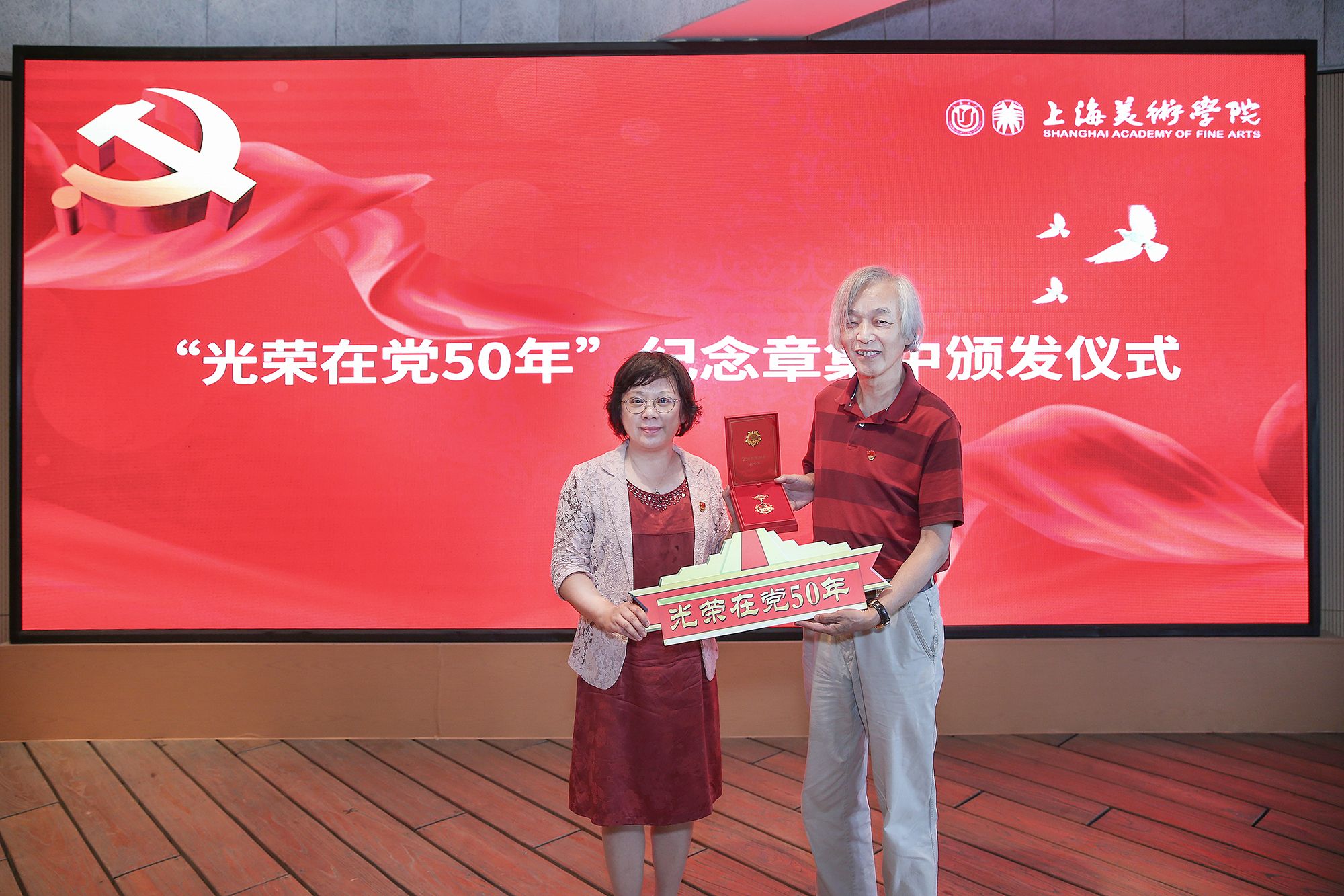 公司党委书记陈静为国画系退休教师陆志文同志颁发“光荣在党50年”纪念章。