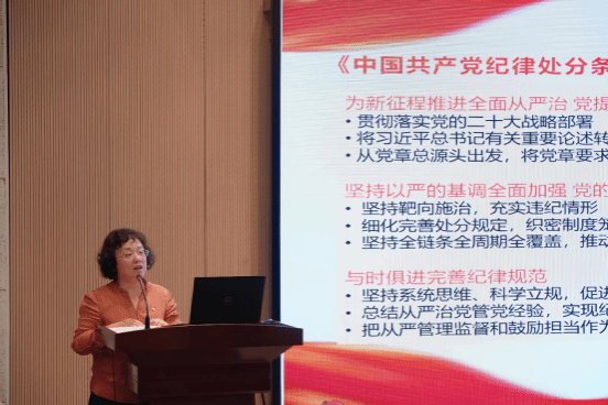 党委书记陈静同志作“《严格遵守“六大纪律”争当遵规守纪的先锋》----学习贯彻新修订的《中国共产党纪律处分条例》”专题党课。她通过《中国共产党纪律处分条例》修订概况及主要内容的阐述,把“六大纪律”的重点、要点、难点,用深入浅出的方式逐一对照,用典型反面案例进行释纪。在分享解读的同时,对党员同志提出要求,党员干部要把《条例》作为必修课,自觉主动、与时俱进、坚持不懈地学习党规党纪,重视、警醒、知止,时刻绷紧纪律和规矩这根弦,自觉接受组织的教育、管理、监督,注重小事小节,使铁的纪律真正转化为党员干部的日常习惯和自觉遵循。