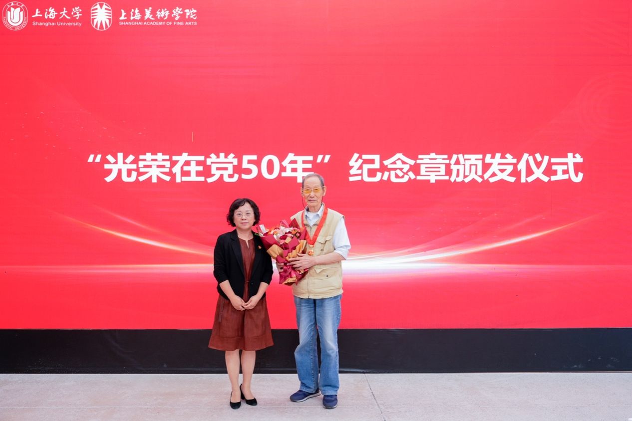 “光荣在党50年”纪念章的颁发仪式上,党委书记陈静为老同志代表余德彰老师颁发纪念奖章,感谢老同志为党和人民做出的贡献。老同志的坚守和付出,激励着每一位党员不忘初心、砥砺前行。