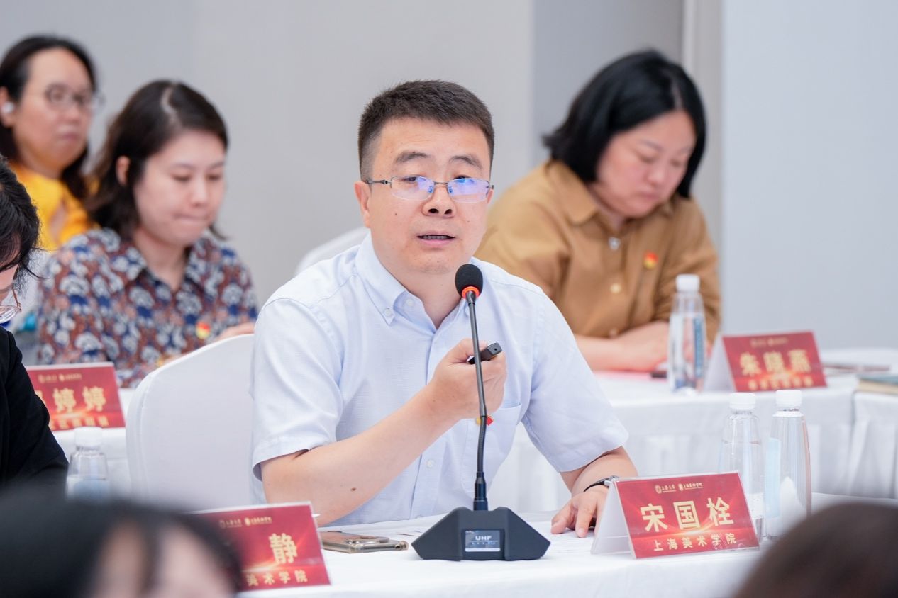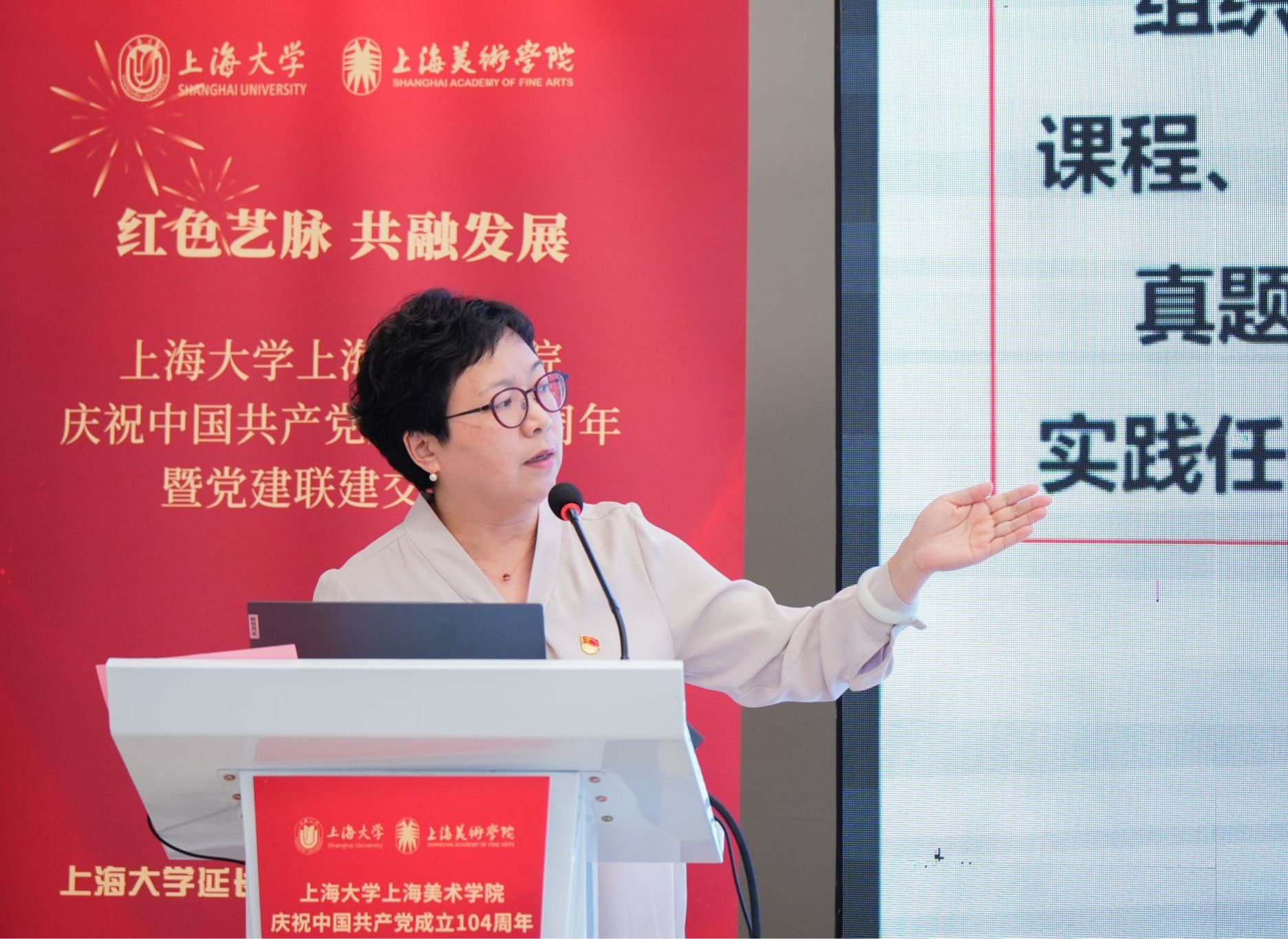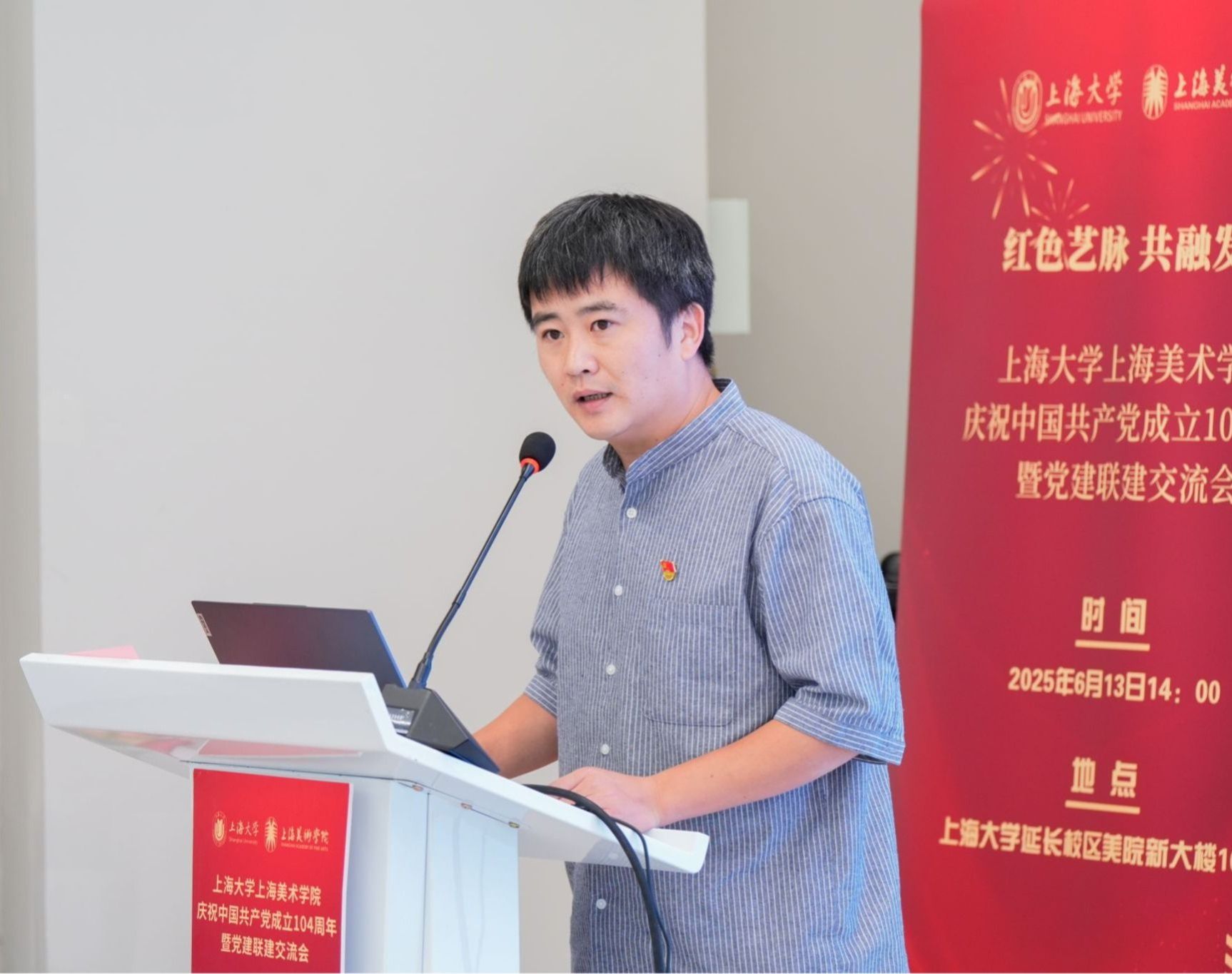 在党建联建成果介绍环节,国油版雕党支部副书记游帅、建筑系党支部书记魏秦、设计系党支部书记赵蕾分别展示了党建工作中的创新实践。他们通过生动的合作案例,展示了在学科交叉、技术融合、美育辐射、美育浸润、人才培养等方面,党建工作与专业特色深度融合的共建成果。