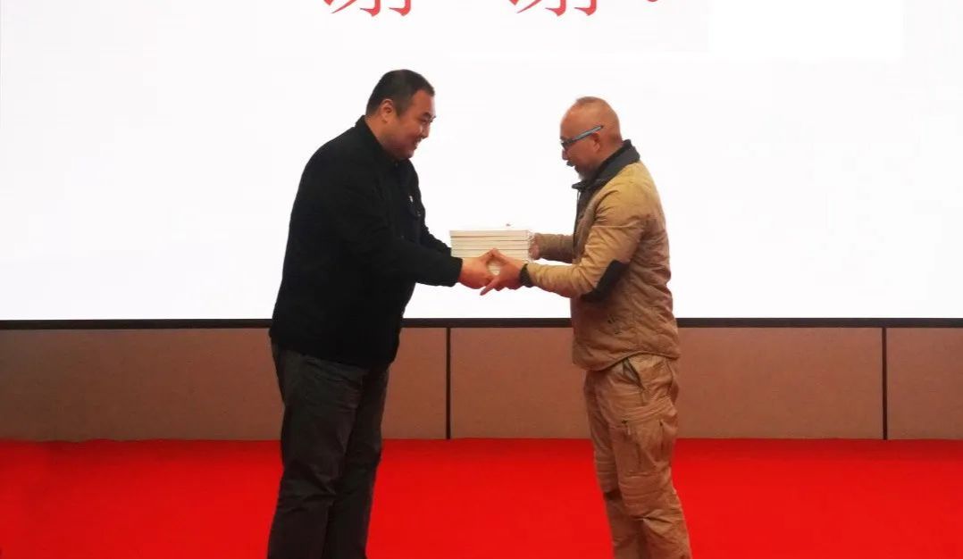 段春义代表中共上海市委党史研究室向师生赠送《龙华英烈画传》系列丛书,鼓励同学们从历史资料间挖掘创作素材,于英雄事迹中汲取精神力量。