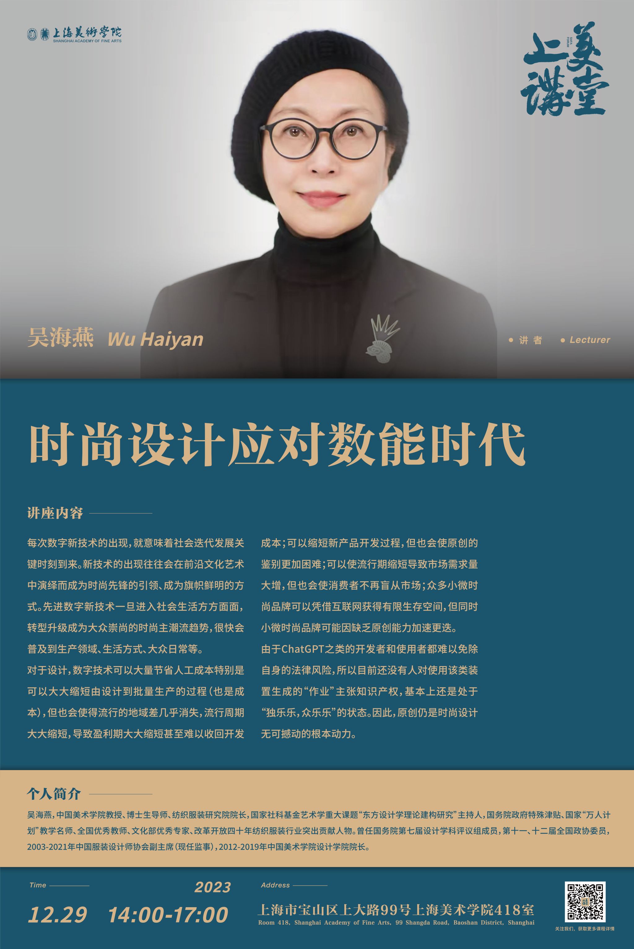 中国美术公司教授、博士生导师、纺织服装研究院经理,国家社科基金艺术学重大课题“东方设计学理论建构研究”主持人,国务院政府特殊津贴、国家“万人计划”教学名师、全国优秀教师、文化部优秀专家、改革开放四十年纺织服装行业突出贡献人物。