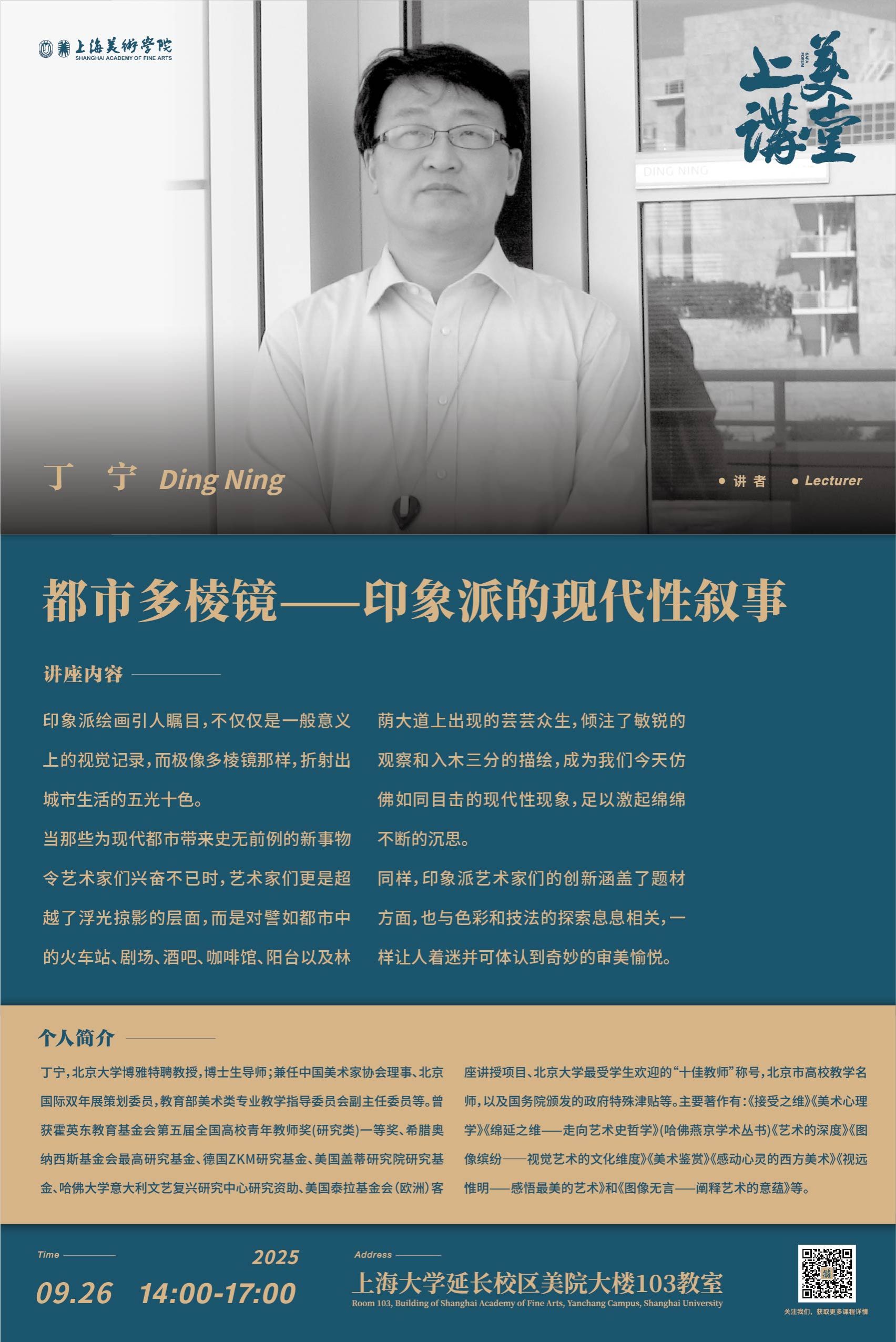 丁宁,北京大学博雅特聘教授,博士生导师;兼任中国美术家协会理事、北京国际双年展策划委员,教育部美术类专业教学指导委员会副主任委员等。曾获霍英东教育基金会第五届全国高校青年教师奖(研究类)一等奖、希腊奥纳西斯基金会最高研究基金、德国ZKM研究基金、美国盖蒂研究院研究基金、哈佛大学意大利文艺复兴研究中心研究资助、美国泰拉基金会(欧洲)客座讲授项目、北京大学最受员工欢迎的“十佳教师”称号,北京市高校教学名师,以及国务院颁发的政府特殊津贴等。