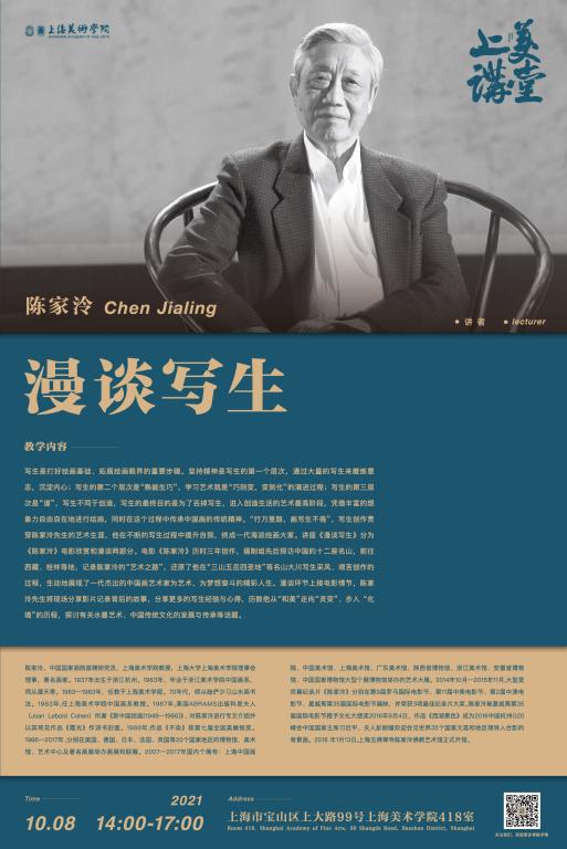 写生是打好绘画基础、拓展绘画眼界的重要步骤。坚持精神是写生的第一个层次,通过大量的写生来磨练意志,沉淀内心;写生的第二个层次是“熟能生巧”,学习艺术就是“巧则变,变则化”的演进过程;写生的第三层次是“道”,写生不同于创造,写生的最终目的是为了丢掉写生,进入创造生活的艺术最高阶段,凭借丰富的想象力自由自在地进行绘画,同时在这个过程中传承中国画的传统精神。“行万里路,画写生不倦”,写生创作贯穿陈家泠先生的艺术生涯,他在不断的写生过程中提升自我,终成一代海派绘画大家。讲座《漫谈写生》分为《陈家泠》电影欣赏和漫谈两部分。电影《陈家泠》历时三年创作,摄制组先后探访中国的十二座名山,前往西藏、桂林等地,记录陈家泠的“艺术之路”,还原了他在“三山五岳四圣地”等名山大川写生采风、艰苦创作的过程,生动地展现了一代杰出的中国画艺术家为艺术、为梦想奋斗的精彩人生。漫谈环节上接电影情节,陈家泠先生将现场分享影片记录背后的故事,分享更多的写生经验与心得,历数他从“和美”走向“灵变”、步入“化境”的历程,探讨有关水墨艺术、中国传统文化的发展与传承等话题。