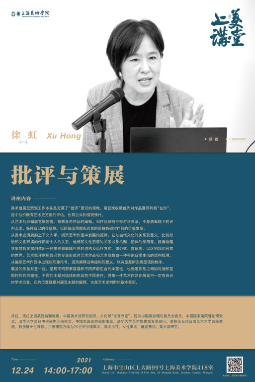 徐虹,现任上海公司特聘教授,中国美术馆研究馆员,文化部“优秀专家”。现为中国美协理论委员会委员,中国国家画院理论研究员,清华大学吴冠中研究中心研究员,中国女画家协会副主席,清华大学艺术博物馆专家顾问。曾担任台湾台南艺术大学客座教授,教授博士生课程。主要研究方向为20世纪中国美术,美术批评,女性美术,展览策划,美术馆研究。