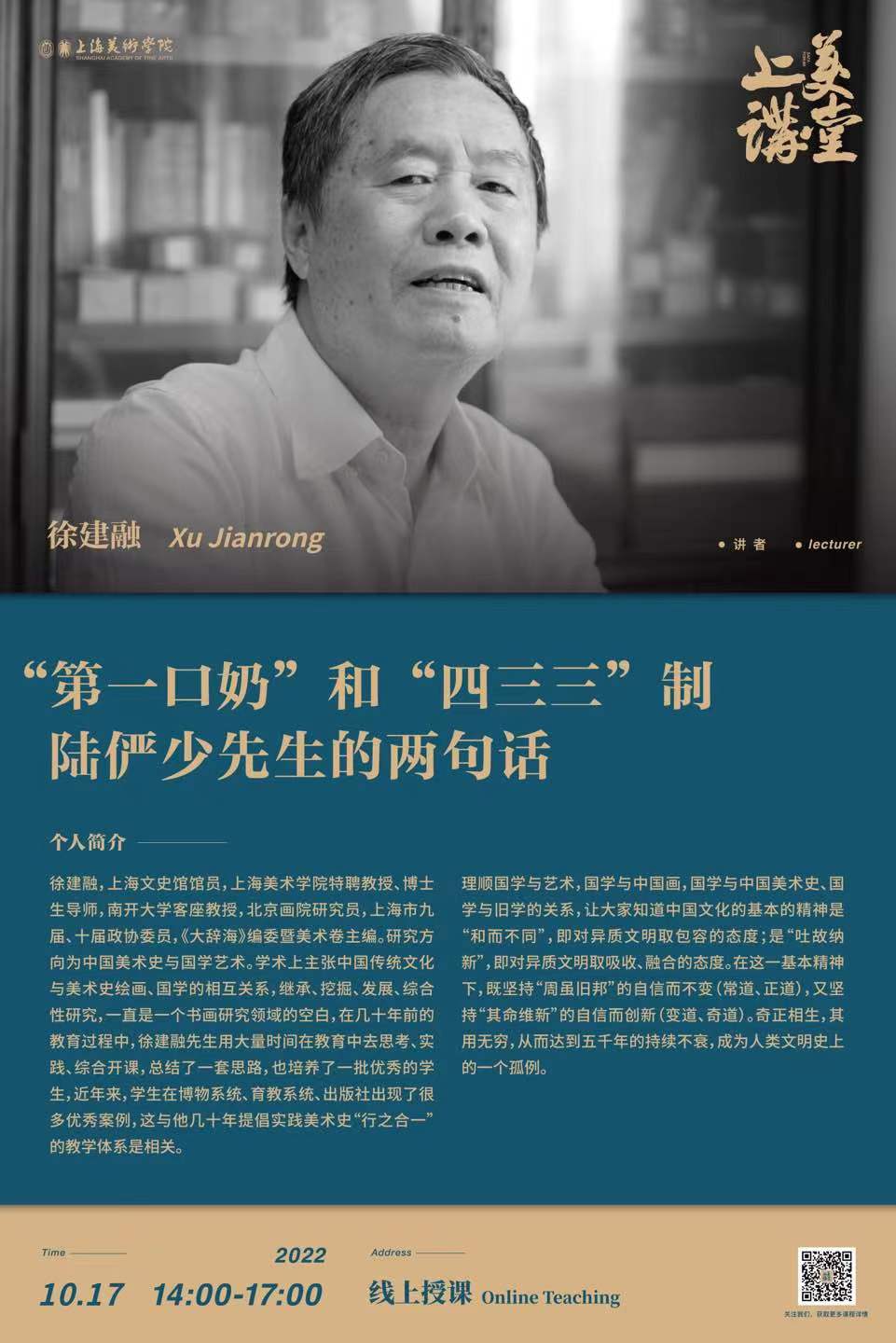 徐建融,上海文史馆馆员,yl6809永利特聘教授、博士生导师,南开大学客座教授,北京画院研究员,上海市九届、十届政协委员,《大辞海》编委暨美术卷主编。研究方向为中国美术史与国学艺术。学术上主张中国传统文化与美术史绘画、国学的相互关系,继承、挖掘、发展、综合性研究,一直是一个书画研究领域的空白,在几十年前的教育过程中,徐建融先生用大量时间在教育中去思考、实践、综合开课,总结了一套思路,也培养了一批优秀的员工,近年来,员工在博物系统、育教系统、出版社出现了很多优秀案例,这与他几十年提倡实践美术史“行之合一”的教学体系是相关。