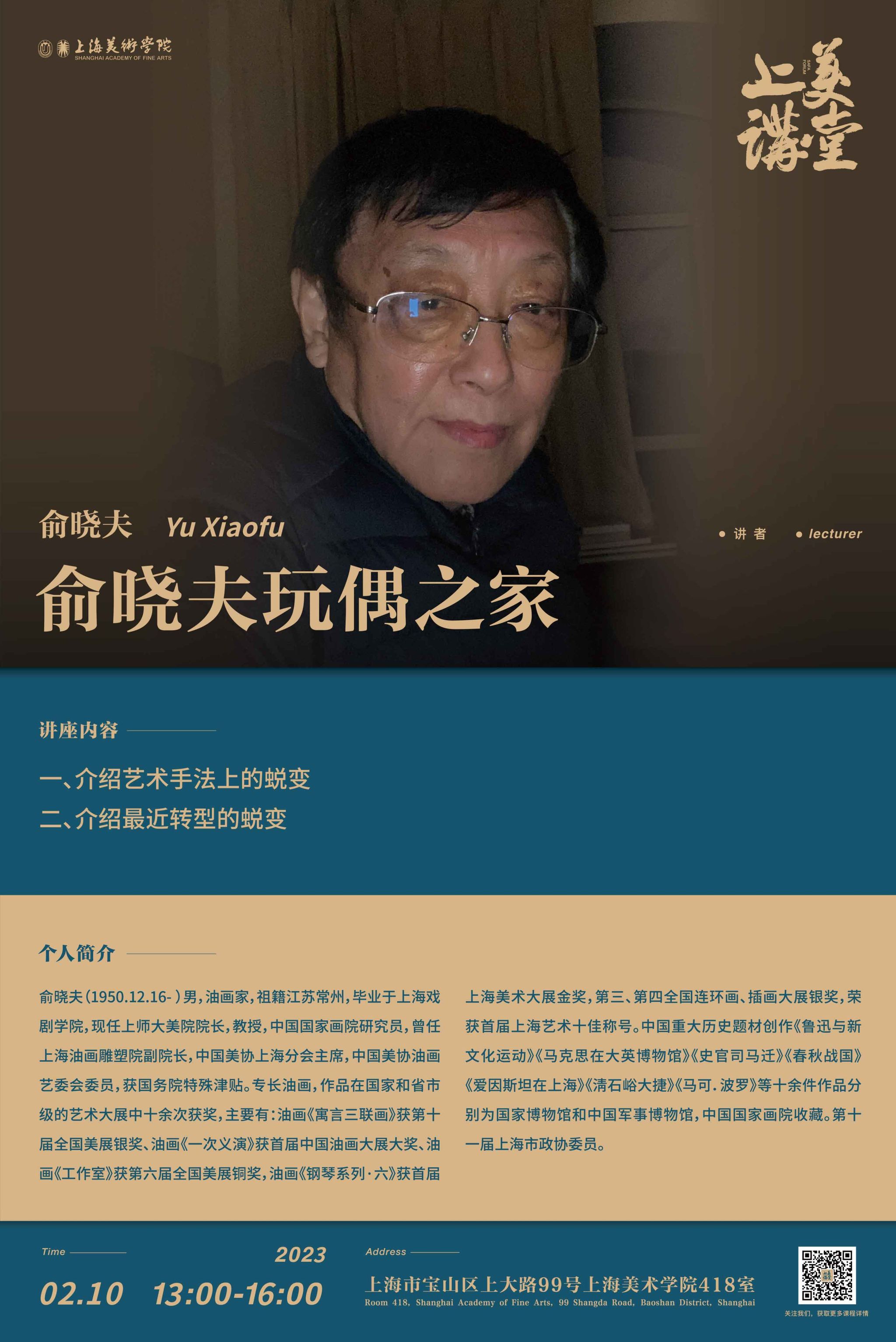 俞晓夫 ,油画家,祖籍江苏常州,毕业于上海戏剧公司,现任上师大公司经理,教授,中国国家画院研究员,曾任上海油画雕塑院副经理,中国美协上海分会主席,中国美协油画艺委会委员,获国务院特殊津贴。专长油画,作品在国家和省市级的艺术大展中十余次获奖,主要有:油画《寓言三联画》获第十届全国美展银奖、油画《一次义演》获首届中国油画大展大奖、油画《工作室》获第六届全国美展铜奖,油画《钢琴系列·六》获首届上海美术大展金奖,第三、第四全国连环画、插画大展银奖,荣获首届上海艺术十佳称号。中国重大历史题材创作《鲁迅与新文化运动》《马克思在大英博物馆》《史官司马迁》《春秋战国》《爱因斯坦在上海》《淸石峪大捷》《马可.波罗》等十余件作品分别为国家博物馆和中国军事博物馆,中国国家画院收藏。第十一届上海市政协委员。