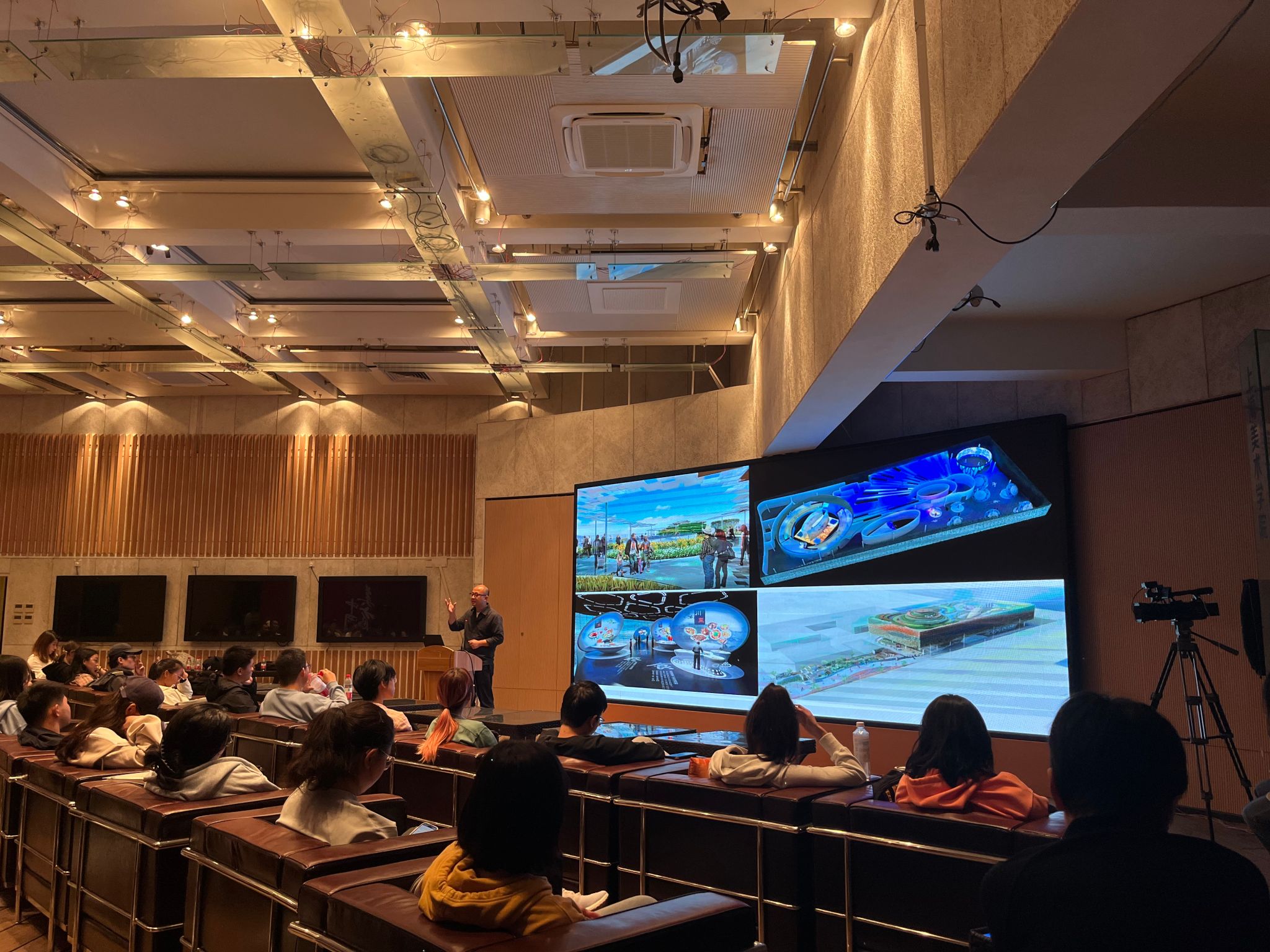 此后,程雪松向同学们介绍了其团队参与2015年和2020年世博会中国馆设计竞标的方案——米兰世博会中国馆方案“守望五色土”,及迪拜世博会中国馆方案“心舟”,阐述了方案构思和创作实践中对国家形象构建的深度思考。