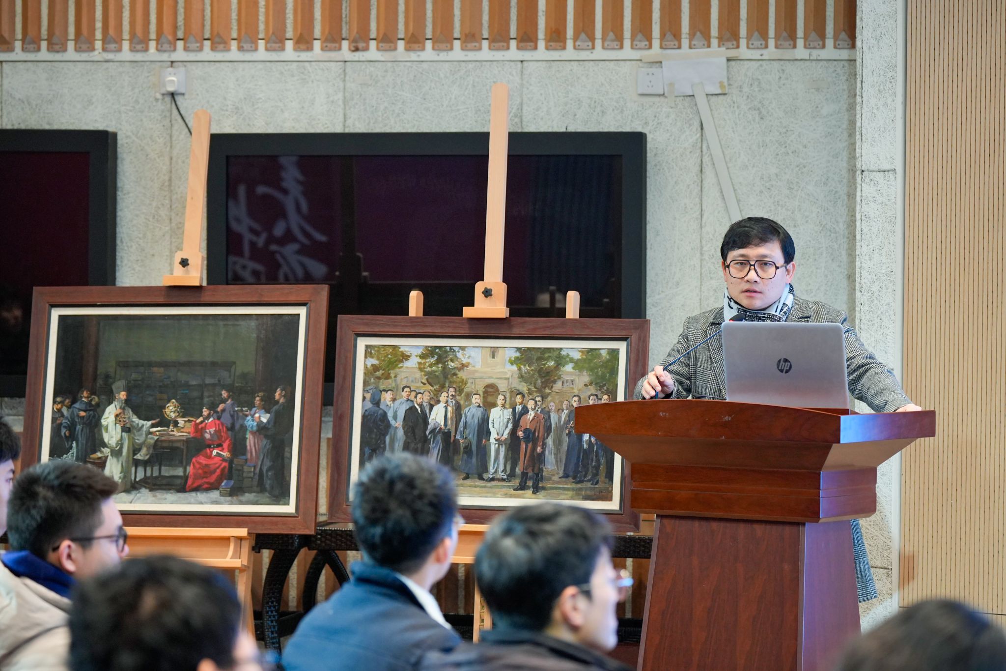 李根老师以“民族的血液——中国现当代油画的本土化审美语言”,为同学们讲授了关于历史画在弘扬民族文化与精神方面的重要作用,在艺术史上享有的崇高地位,同时创作历史画也是对艺术家是全面能力的考验。李根老师结合自己的创作,谈及历史画创作除了艺术家自己创造力的之外,需要注意的党史、政治等外在因素影响,同时,在对《占领总统府》《启航》等一系列中国经典历史作品深入分析后,扭转了一些员工对于中国油画发展水平的认知,认识到“油画不再是西方专属,而是一种融入民族血液”的本土化表达手法。同学们也从课程中学会了耐心和细致的观察,提升了自己在文化理解、细节观察和跨文化交流等方面的能力。