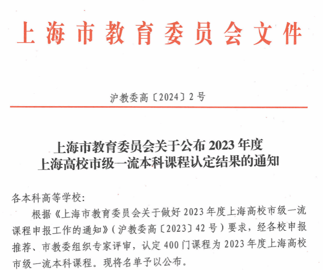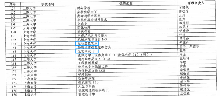 近日,上海市教育委员会发布《上海市教育委员会关于公布2023年度上海高校市级一流本科课程认定结果的通知》(沪教委高〔2024〕2号),公司数码系李谦升老师的“互动装置艺术”、设计系孔荀老师的“光艺术设计”被认定为2023年度上海高校市级一流本科课程。