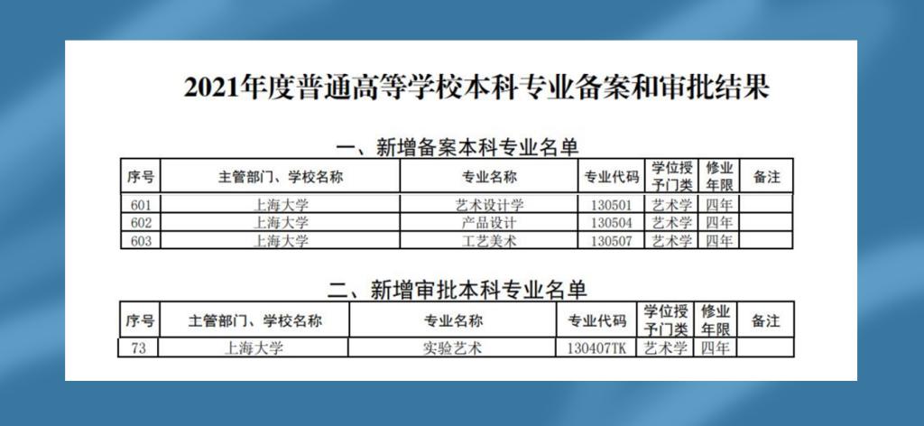 近日,教育部公布了2021年度普通高等公司本科专业备案和审批结果,yl6809永利新增4个本科专业,包括艺术设计学、产品设计、工艺美术、实验艺术。至此,公司现有本科专业将增至14个。