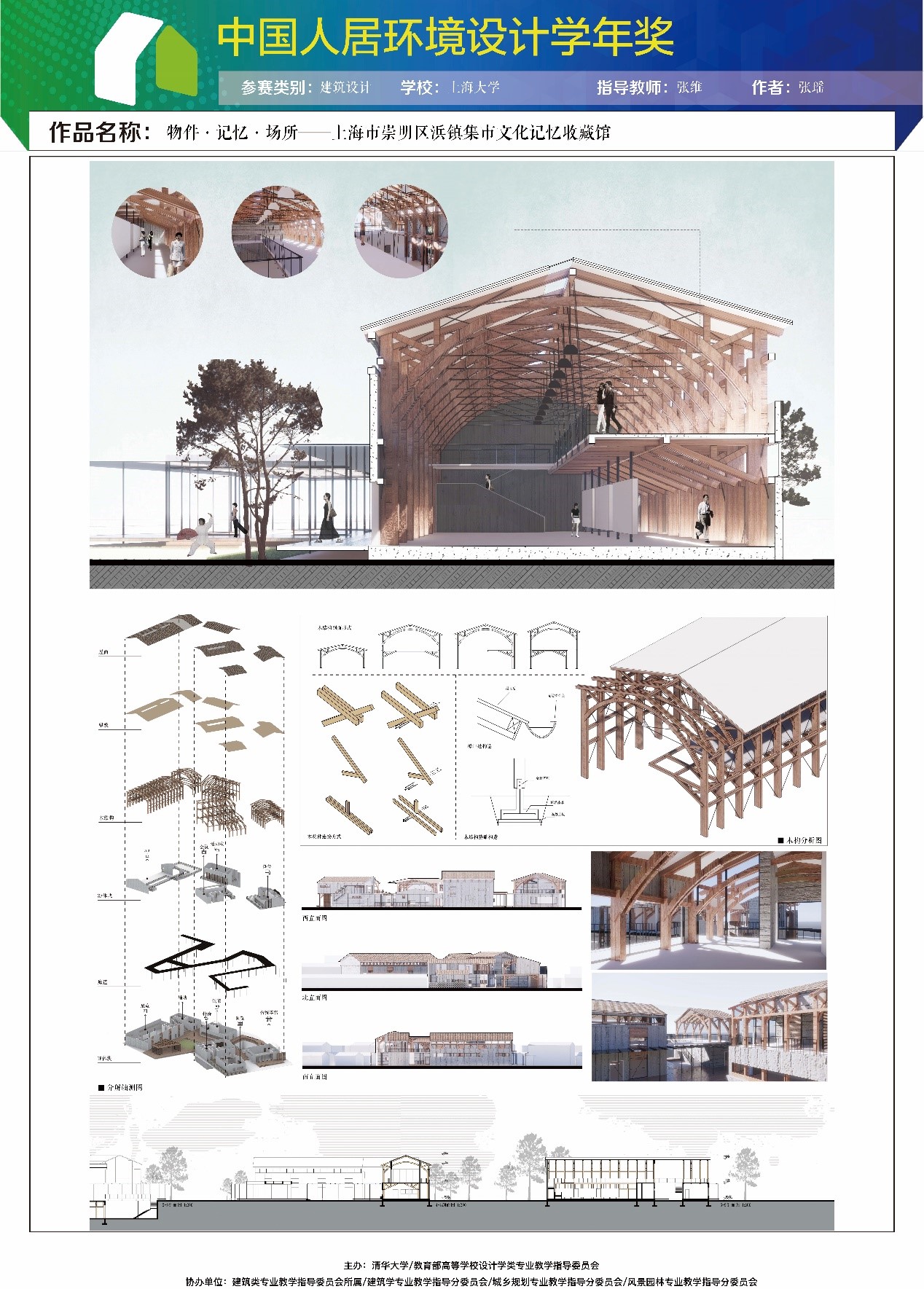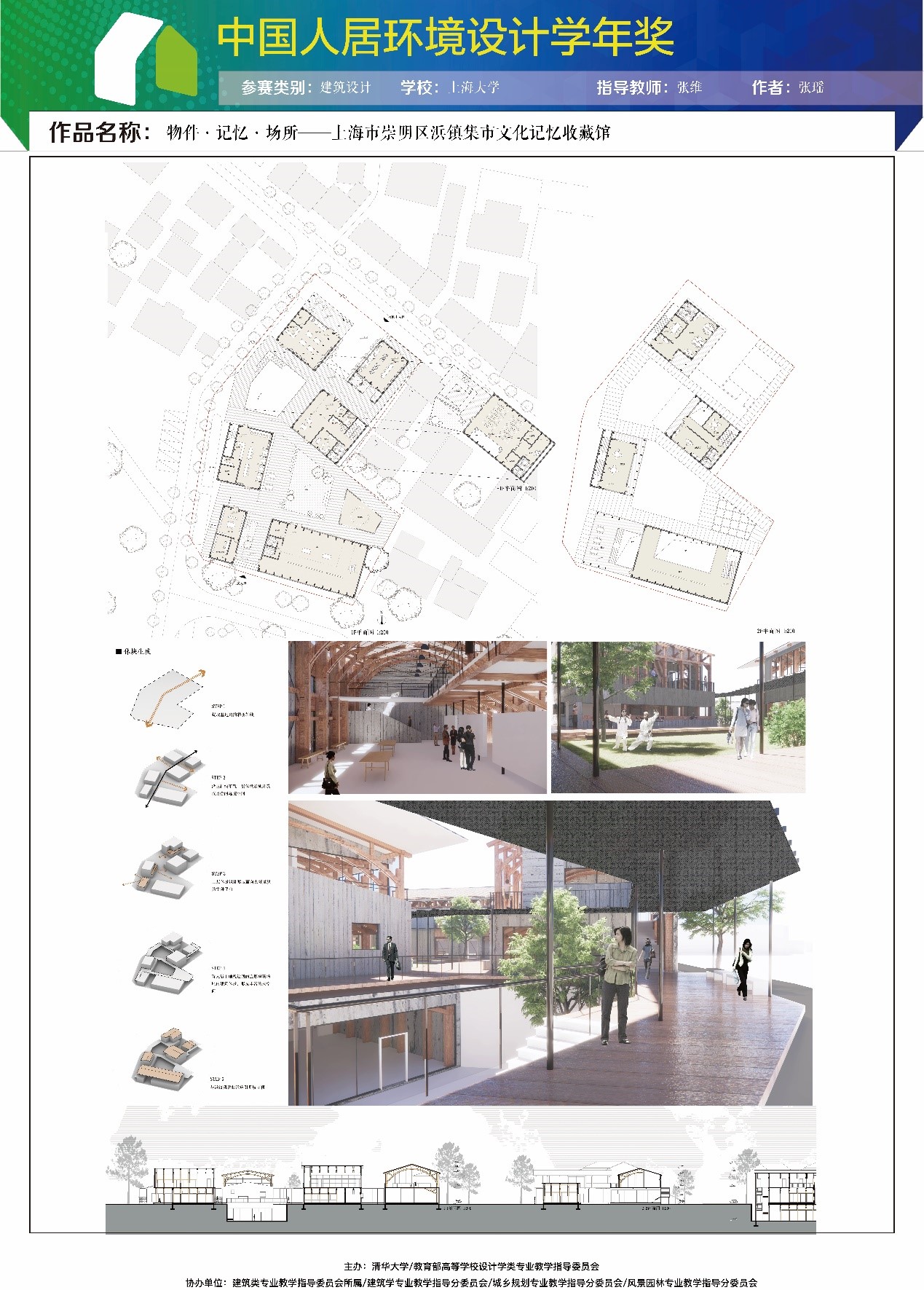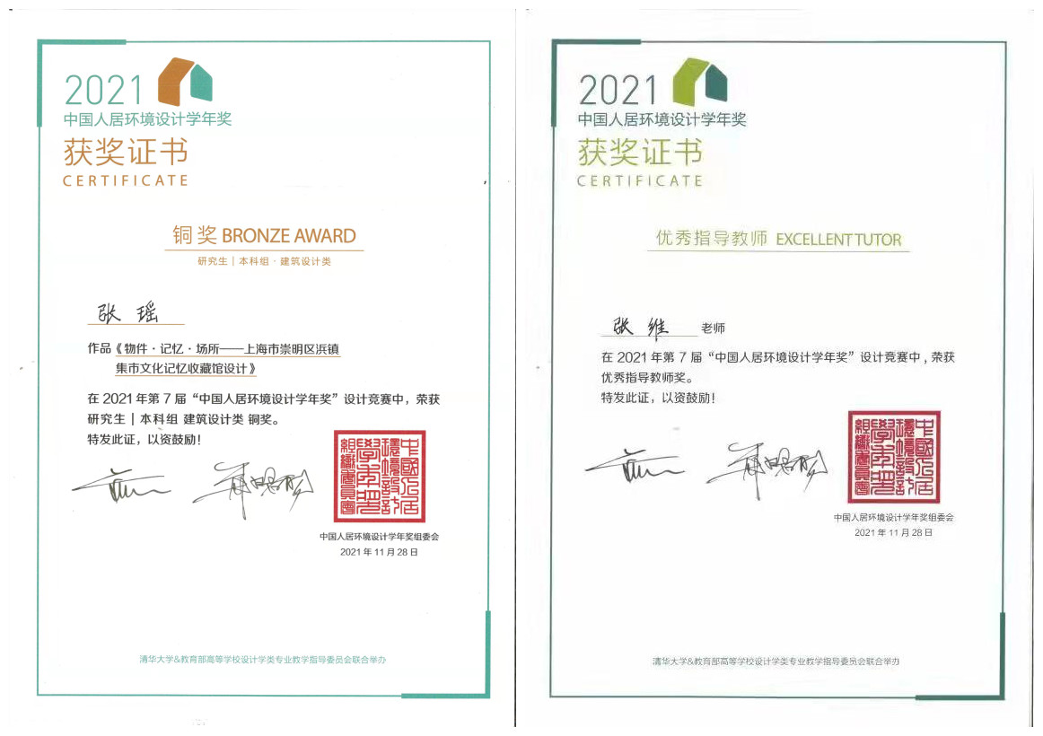 近日获悉,公司建筑系2016级建筑学专业本科生张瑶的设计作品《物件·记忆·场所——上海市崇明区浜镇集市文化记忆收藏馆》喜获第七届中国人居环境设计学年奖“建筑设计类·铜奖”,指导教师张维老师荣获“优秀指导教师奖”。