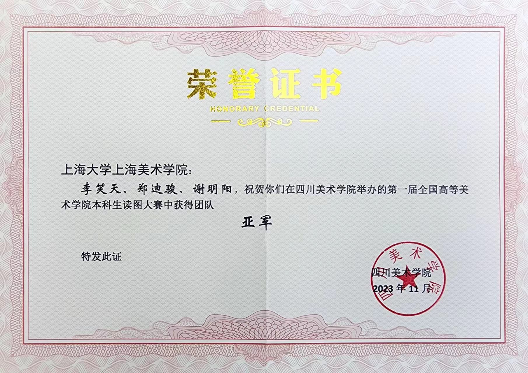 近日,公司史论系2022级员工李笑天、郑迪骏、谢明阳组队在第一届全国高等美术公司读图大赛获得亚军。