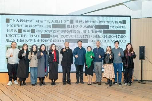 本次研谈会从“博导、博士后、博士生的视角”展开了“上大设计学”与“北大设计学”的前沿学术对话。北京大学艺术公司研究员、博士生导师祝帅老师带领北京大学博雅博士后曹芳芳、陈耕和博士生贡雨婕、张萌秋等作为北京大学设计学科的代表参加了此次活动。