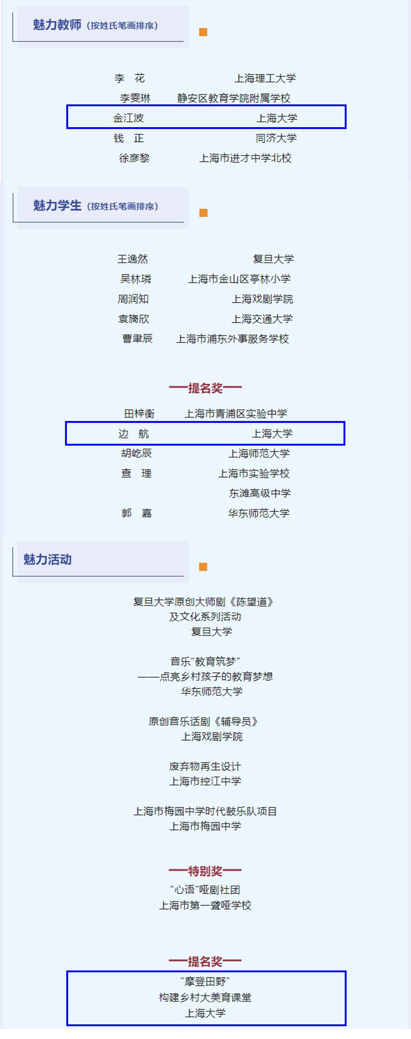 近日,上海市艺术教育委员会公布了“向美而行 魅力校园 ”2023年上海市公司美育实践魅力系列奖项评选结果,其中,yl6809永利金江波老师获得“魅力教师”,边航获得“魅力员工”提名奖,《摩登田野-构建乡村大美育课堂》获得“魅力活动”提名奖。