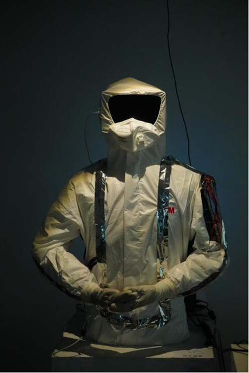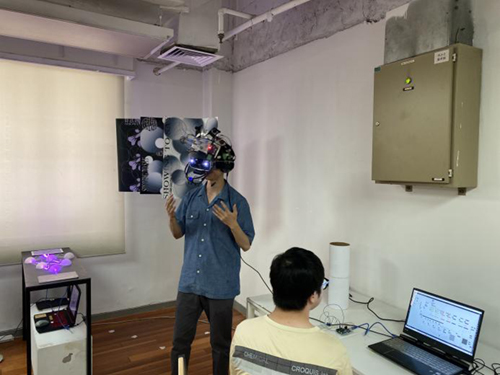 装置课展览现场,同学在介绍自己的可穿戴互动装置